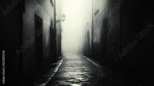 © Chingiz, Obraz premium A dimly lit, desolate city street shrouded in foggy darkness, evoking a crime-filled ambiance. Perfect backdrop for eerie scenes or narratives
