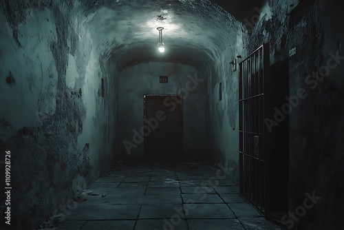 © Mrsabata, Obraz premium A dimly lit, eerie corridor with a barred door, suggesting a prison or abandoned building.