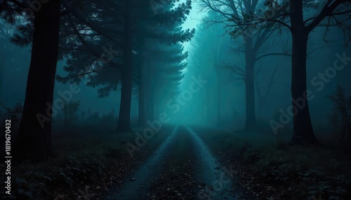 Naklejka premium A dimly lit, eerie forest path at night, shrouded in mist and ominous...