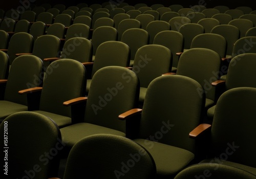 Naklejka premium A dimly lit hall features many rows of unoccupied dark green theater seats...