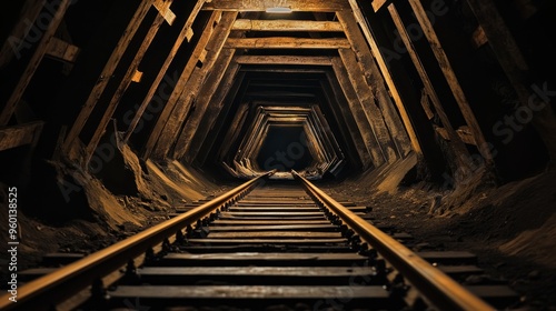 © BerkahStock, Obraz premium A dimly lit mine tunnel with wooden supports and railway tracks leading into darkness.