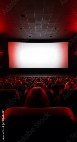 © Blue Rain, Fototapeta premium A dimly lit movie theater with a large screen and audience