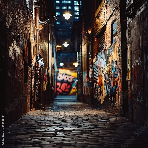 © ckybe, Fototapeta premium A dimly lit passageway paved with cobblestones, bordered by weathered brick walls splashed with colorful street art.