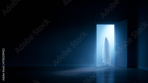 © ChaoticDesignStudio, Obraz premium A dimly lit room features an open door with a glowing blue light. A ghostly figure draped in a white sheet stands just inside the doorway, creating an eerie atmosphere during the night