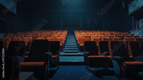 © h4kunA, Naklejka premium A dimly lit theater showcasing empty orange seats leading to a stage.