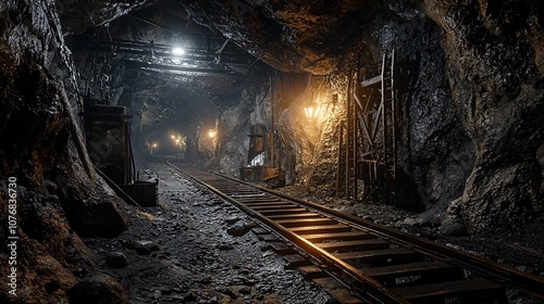 Naklejka premium A dimly lit underground mine showcasing wooden supports and railway tracks,...