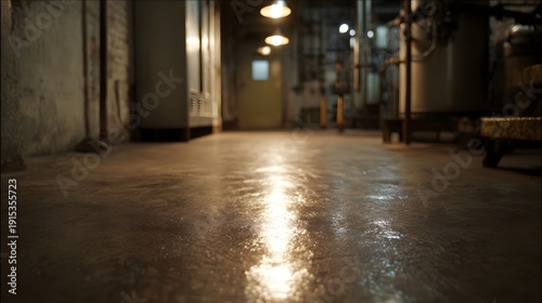 Fototapeta premium A dimly lit wet industrial corridor with overhead lights casting glowing reflections on the textured concrete floor