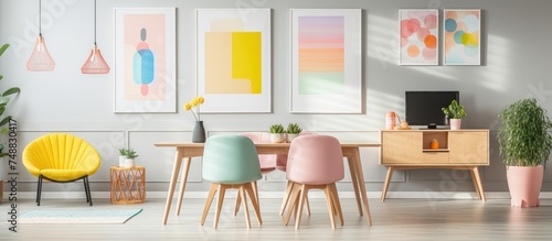 © Lasvu, Fototapeta premium A dining room featuring a table with pastel lamps above, chairs in yellow green and grey, and colorful posters on a white wall.