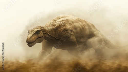 Obraz premium A dinosaur depicted in a dusty, prehistoric landscape, showcasing its...