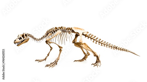 Obraz premium A dinosaur skeleton stands on a white background.