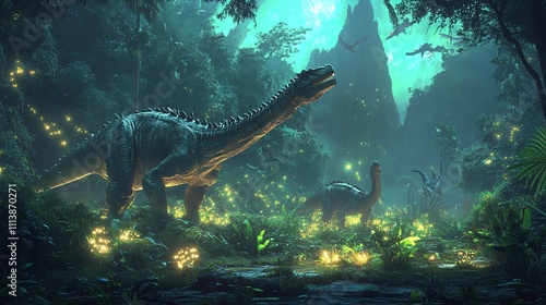 © Galib, Fototapeta premium A dinosaur stands in a jungle at night with fireflies.