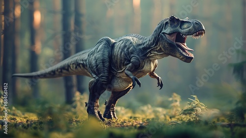 Naklejka premium A dinosaur stands in a misty forest landscape, bathed in soft sunlight filtering through the trees. The scene captures a moment of silent power and ancient beauty in nature.