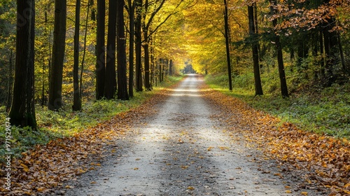 © Wall, Fototapeta premium A dirt path, bordered by dense trees and shedding foliage on either side