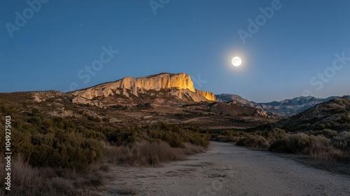 © logyartstudios, Obraz premium A dirt path leads towards a mountain illuminated by a full moon in the night sky.