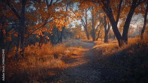 Fototapeta premium A dirt path surrounded by trees with yellow leaves and grass on either side...