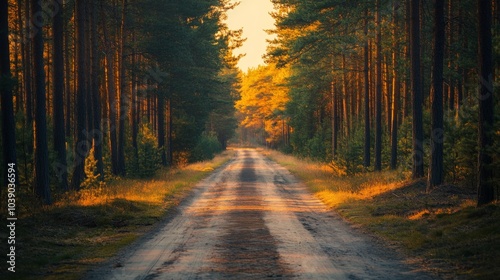 Obraz premium A Dirt Path Through a Golden-Lit Pine Forest