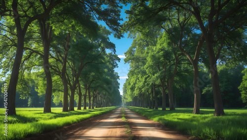 © Rizky Rahmat Hidayat, Obraz premium A dirt path through a park with lush green trees during the daytime in summertime. Ai Generative.