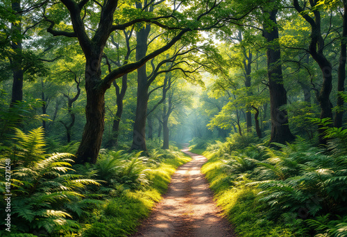 Naklejka premium A dirt path winding through a lush, green forest with tall trees and dense foliage on both sides