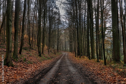 © ckybe, Obraz premium A dirt path winds through a dense, leaf-strewn forest under a canopy of tall, bare trees on a misty autumn day.