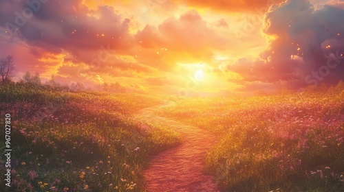 © Timeless Touch, Obraz premium A dirt pathway meandering through a sun-drenched meadow, with the sky ablaze in warm orange and pink as the sun sets behind the horizon
