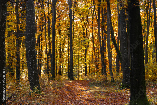 © Rejdan, Fototapeta premium A dirt road covered with fallen dry leaves in an autumn forest