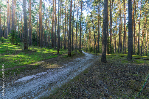 © Sergei, Obraz premium A dirt road in a forest with trees on both sides