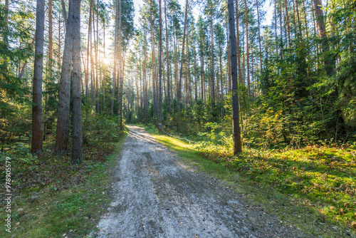 © Sergei, Fototapeta premium A dirt road in a forest with trees on both sides