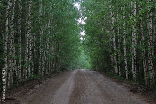 Naklejka premium A dirt road in a young birch forest on a sunny summer day