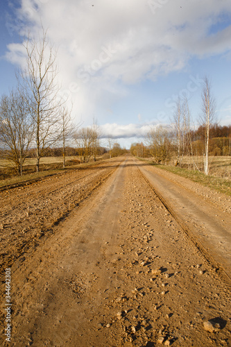Naklejka premium A dirt road in the countryside goes into the distance. Beautiful clouds and thin birches along the clay road in spring