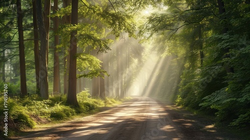 © Olga, Fototapeta premium a dirt road in the middle of a forest with sunbeams shining through the trees on either side of the road is a dirt road with green grass and trees on both sides.