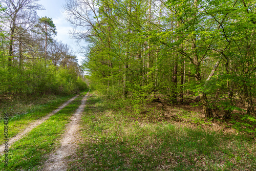 © DZiegler, Fototapeta premium A dirt road into a forest in springtime