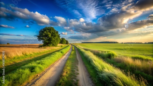 Fototapeta premium A dirt road leads through green fields