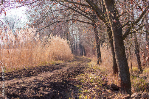 © Roman Bjuty, Obraz premium A dirt road leads through the countryside around the pond.
