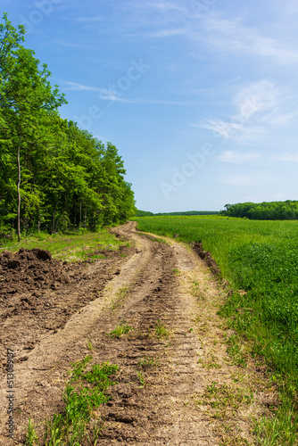 © NAIL BATTALOV, Obraz premium a dirt road located between a forest and a field on a sunny summer day.