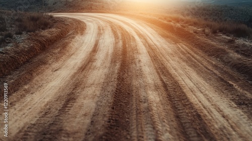 Naklejka premium A dirt road meanders into the glow of a golden sunset, showcasing the beauty...