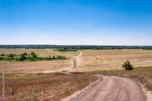 © kurtov, Obraz premium A dirt road passing through a field in a picturesque location.