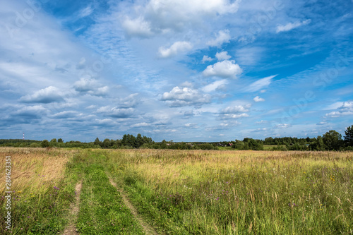 © Valery Smirnov, Fototapeta premium A dirt road passing through a large field with yellow grass.
