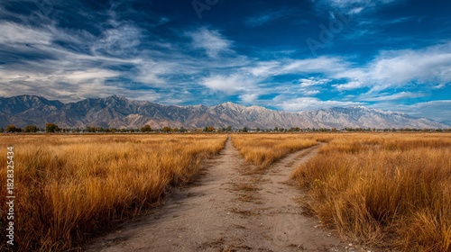 Obraz premium A dirt road splits through golden grasses towards mountains under a vibrant blue sky