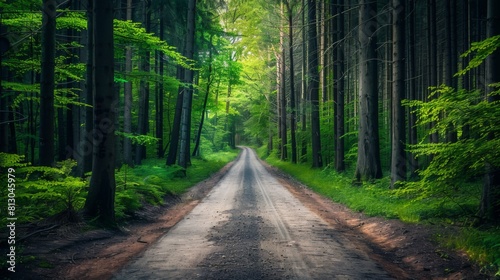 Fototapeta premium A dirt road stretches through a dense forest, adventure background