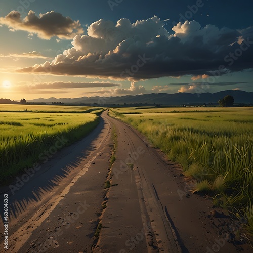 Naklejka premium A dirt road stretches through a golden field towards the setting sun,...