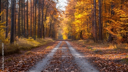Obraz premium a dirt road surrounded by trees with leaves on the ground