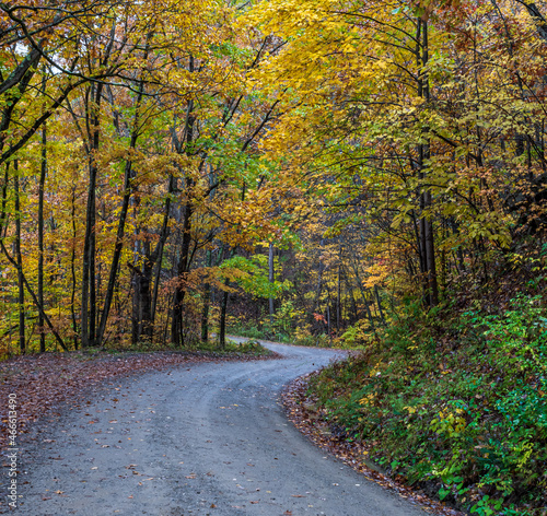 Naklejka premium A dirt road through fall woods in Althom, Pennsylvania, USA on an autumn day