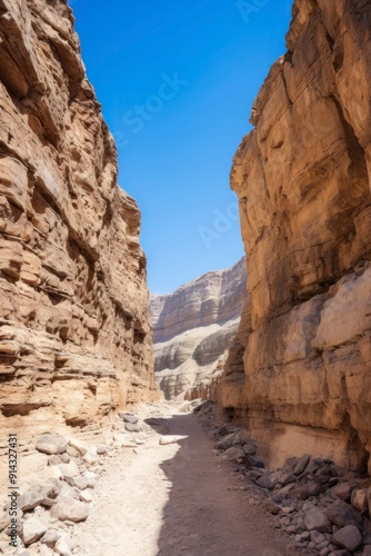 Fototapeta premium A dirt road winding between rocky cliffs in a desert landscape.