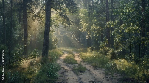 Naklejka premium A dirt road winding through a dense forest with tall trees and underbrush