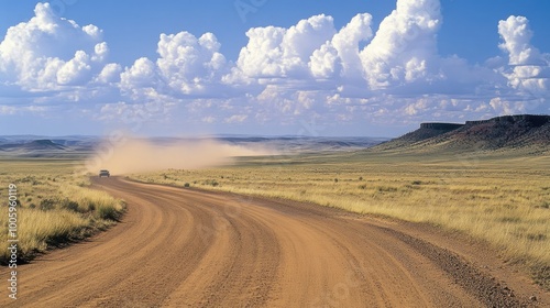 © Sampao, Fototapeta premium A dirt road winding through a flat, open plain, with dust rising behind a distant vehicle and the wide sky overhead.