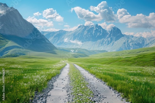 © Fotograf, Fototapeta premium A dirt road winds its way through a vibrant green field, surrounded by nature