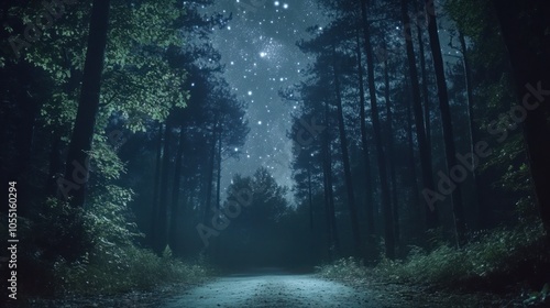 Obraz premium A dirt road winds through a dense forest under a canopy of stars.