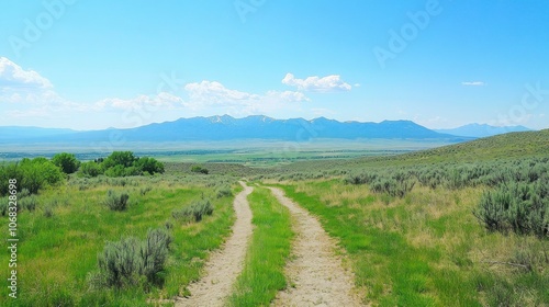 Fototapeta premium A dirt road winds through a green grassy valley with a mountain range in the distance under a clear blue sky.