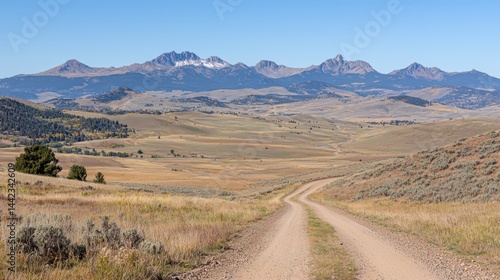 Fototapeta premium A dirt road winds through a vast, open landscape, leading towards a majestic mountain range.