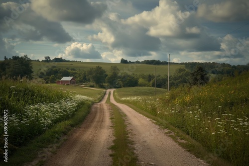 Fototapeta premium A dirt road with a red barn in the distance. Road to somewhere concept